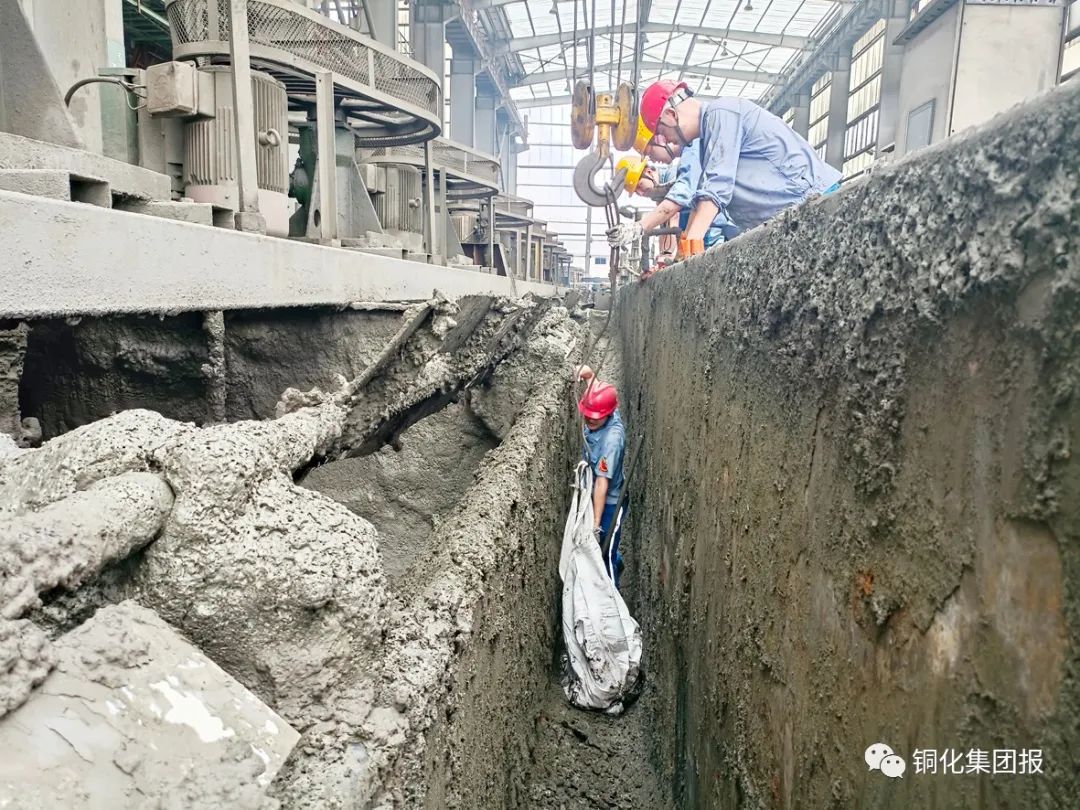 僅53厘米寬的浮選流槽里,身材精瘦的小李一腳泥、一腳水的堅難前行,鏟起了淤礦。剛從槽內(nèi)爬上來的小張,早已是全身汗透,工作服緊緊裹住了身體,汗水吧嗒吧嗒順著下巴直往下滴。